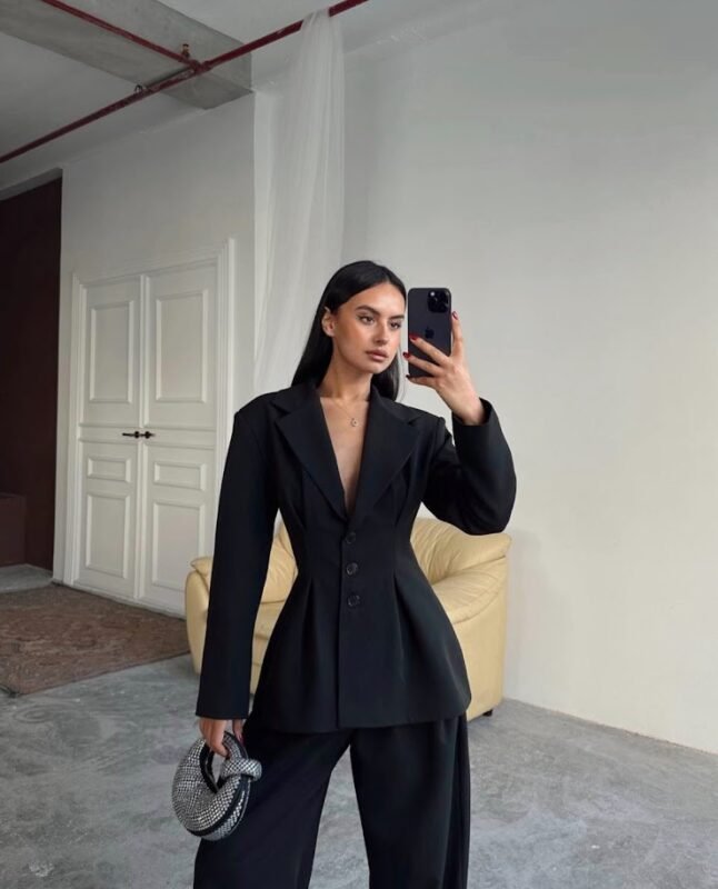 Šis derinys atrodo tvarkingai, bet ne per daug oficialiai. Tiks ir į darbą, ir į miestą. Jei nori daugiau charakterio – pridėk masyvesnius auskarus arba ryškesnę rankinę.
